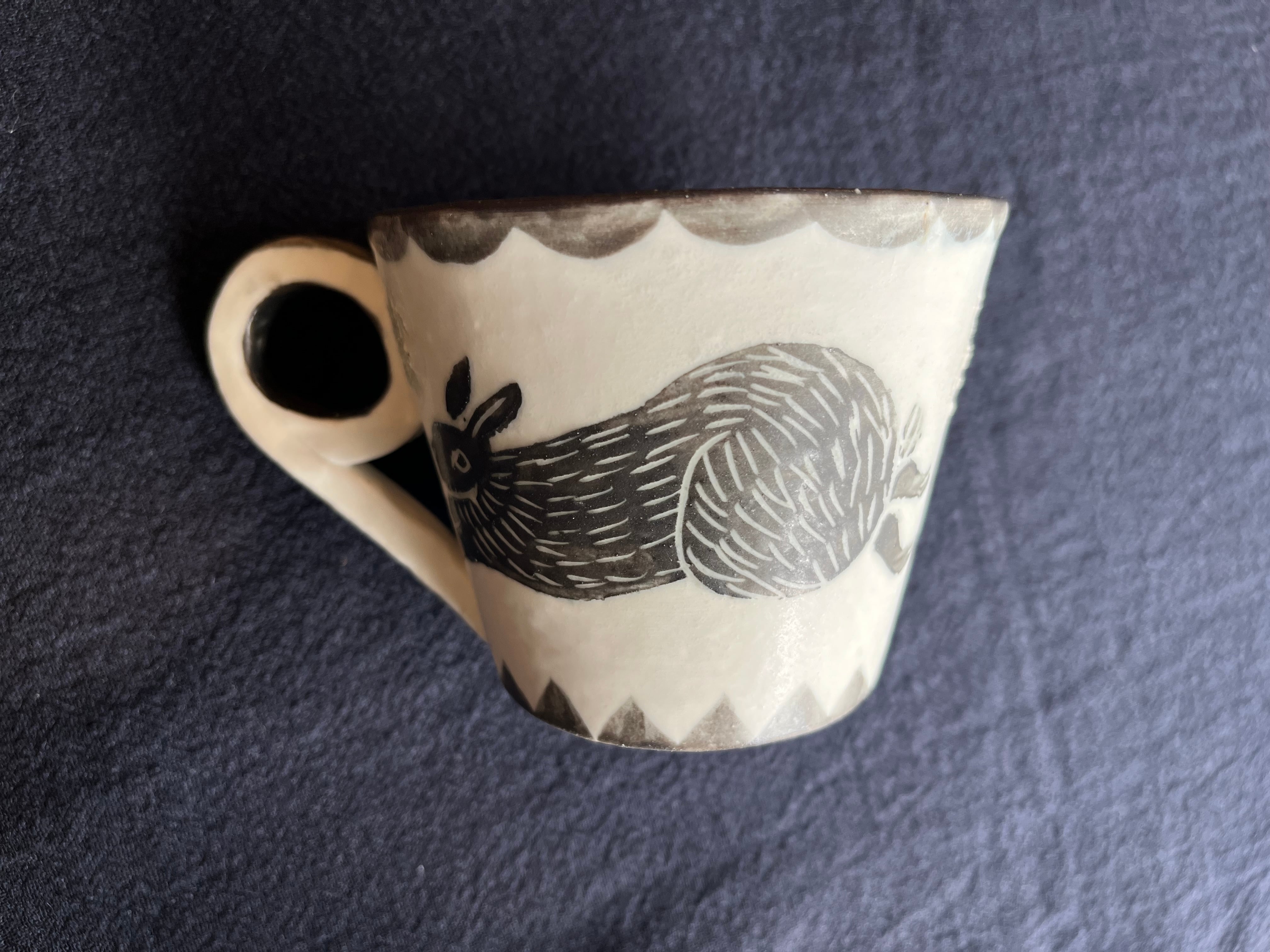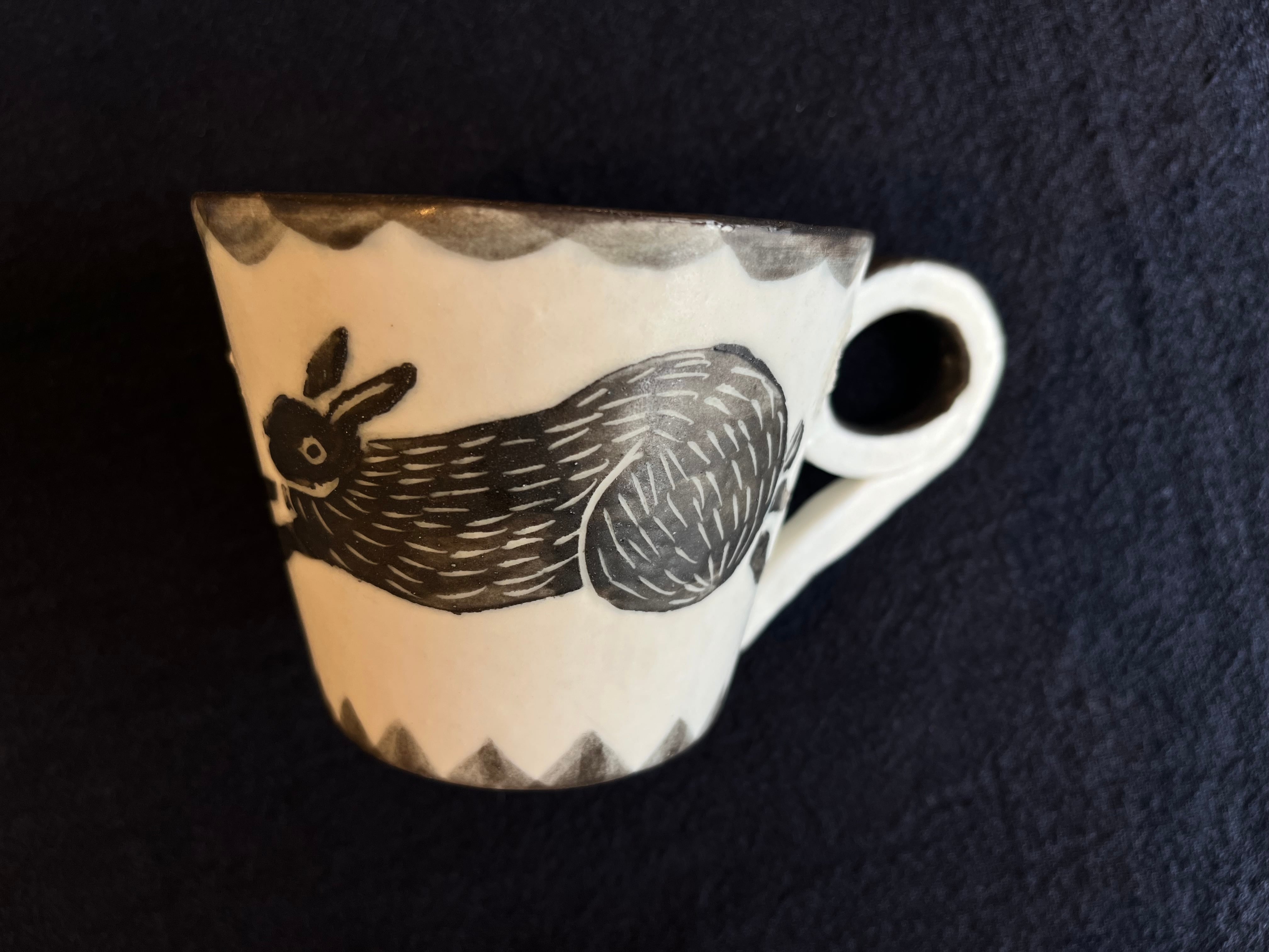版画のような薄い墨黒のウサギが2匹描かれた可愛い作品です。